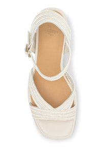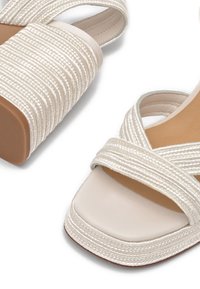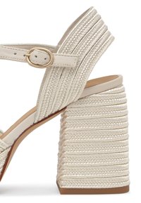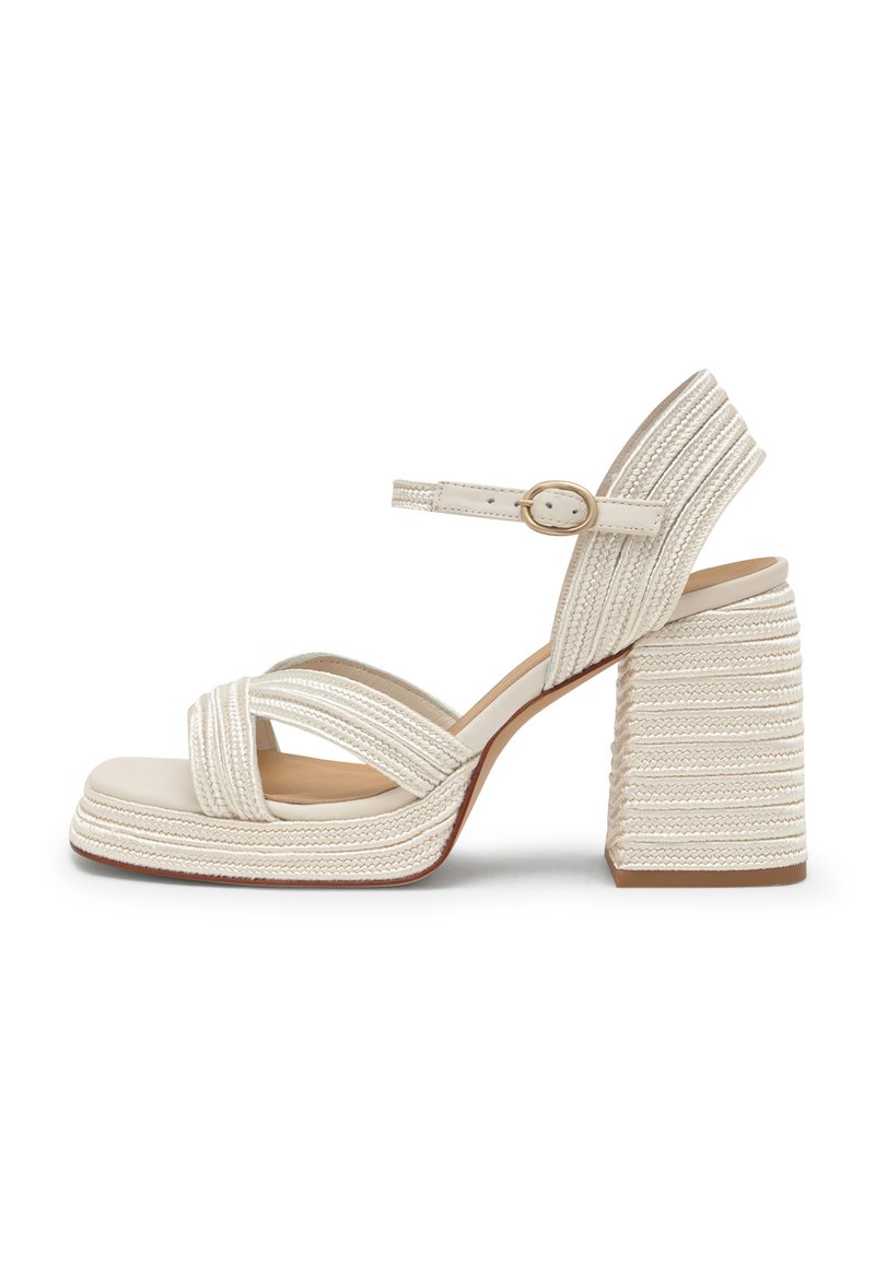 Sandale à talon haut couleur crème avec texture tissée, bride autour de la cheville avec boucle dorée, brides croisées à l'avant, et talon bloc épais.