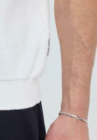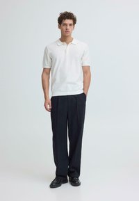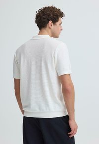 Jeune homme aux cheveux bouclés portant un polo blanc à manches courtes et un pantalon foncé, debout les bras croisés devant un fond uni.