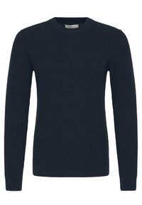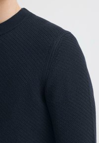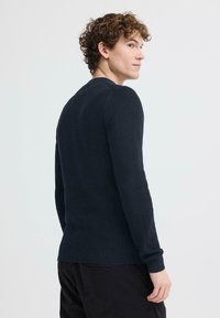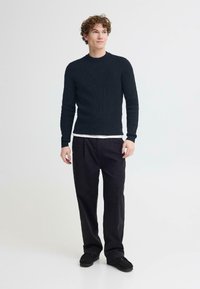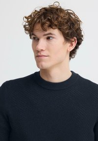 Jeune homme aux cheveux bouclés portant un pull ajusté bleu marine foncé et un pantalon noir, debout avec une main dans la poche, regardant sur le côté.