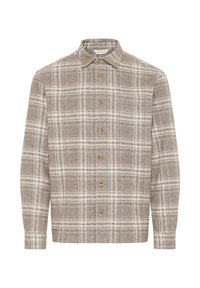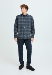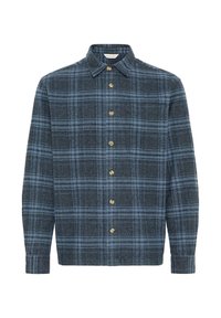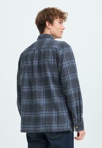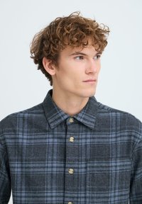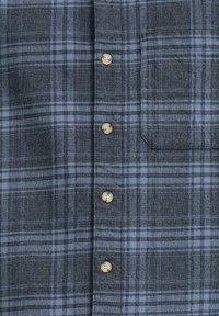 Chemise en flanelle à carreaux gris foncé et bleu, manches longues, boutonnage devant, col pointu, une poche poitrine, texture douce, boutons en bois.