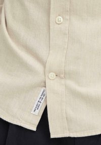 Chemise beige à manches longues avec un col boutonné, texture unie et fermeture à boutons sur le devant. Le modèle ajuste les poignets, porte un pantalon foncé.