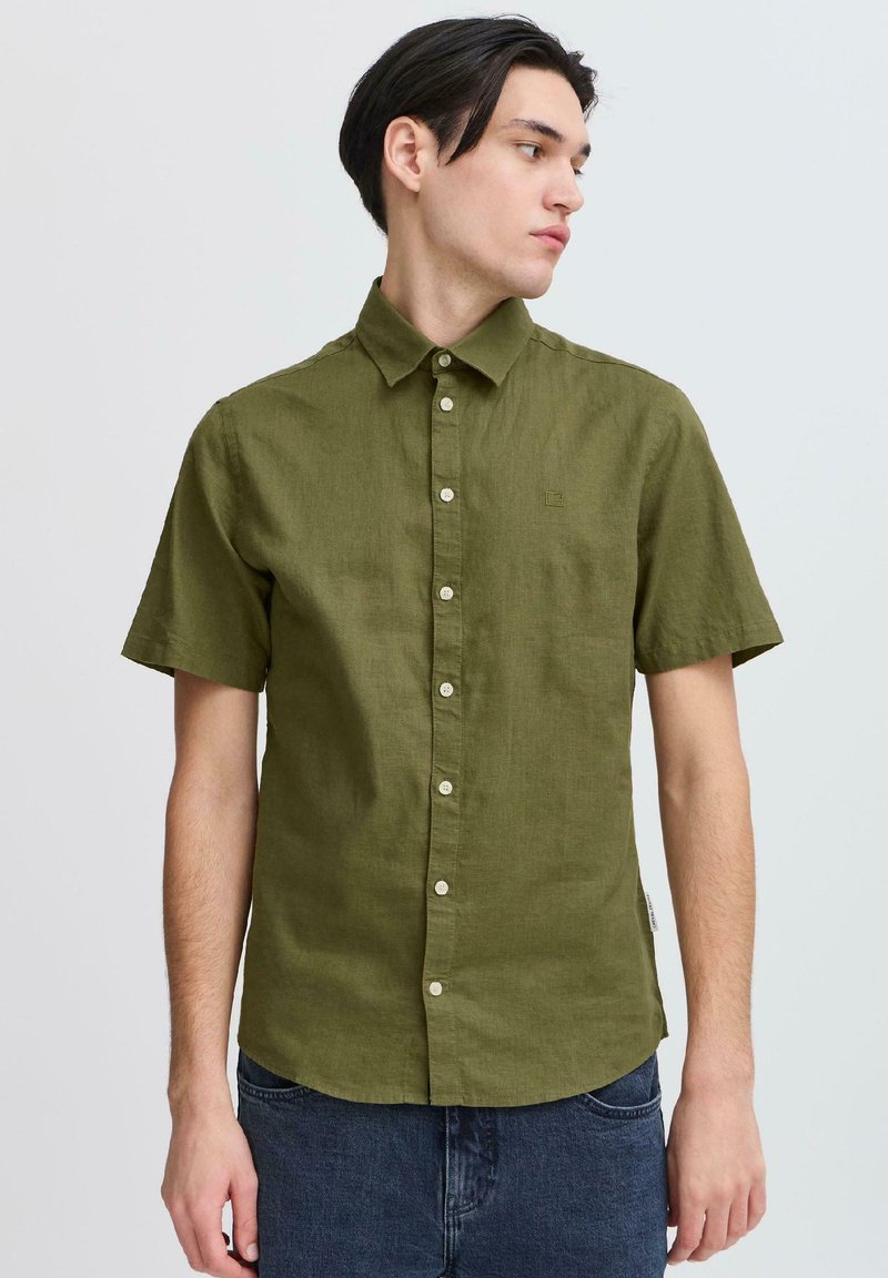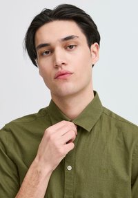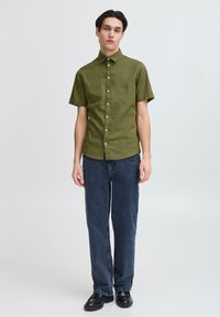 Homme portant une chemise à manches courtes boutonnée vert olive et un jean bleu foncé, regardant vers sa droite sur un fond uni.