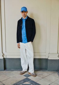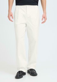 Pantalon blanc à jambe droite avec une texture lisse, présentant deux plis à l'avant. Associé à des mocassins noirs pour créer un contraste.