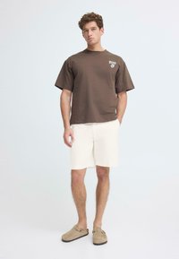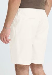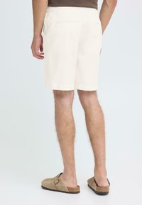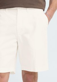 Shorts de couleur claire en tissu à texture lisse. Dotés de poches standard et d'une coupe droite ; portés avec des chaussures beiges sans lacets.