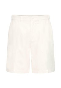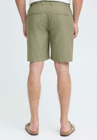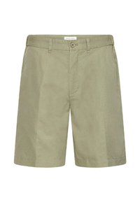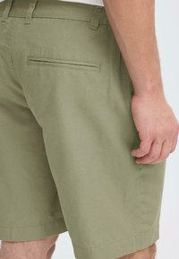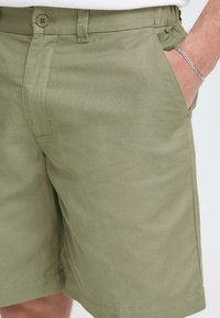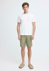 Homme portant un short vert olive avec des poches et des sabots en daim beige sans lacets, debout devant un fond uni.