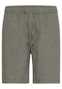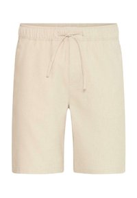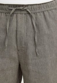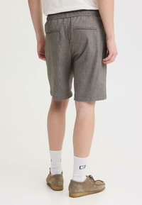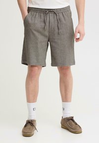 Homme portant un short gris à cordon, des chaussettes blanches et des chaussures en daim marron, debout devant un fond uni clair.