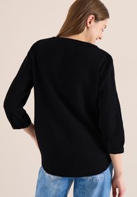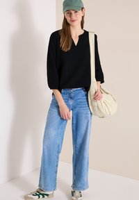 Jeune femme portant une casquette verte, un haut noir à manches longues, un jean bleu, et portant un grand sac à bandoulière de couleur crème.