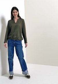 Blouse à manches longues vert olive avec un col en V et un ourlet froncé. Confectionnée dans un tissu lisse, avec une coupe décontractée et des manches retroussables.