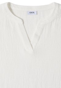 Femme souriante portant une casquette verte, un chemisier blanc texturé à manches longues avec col en V, et un jean en denim bleu, devant un fond beige.
