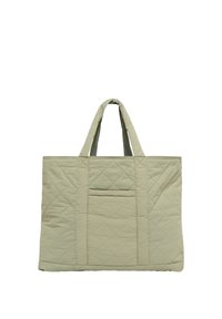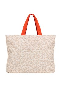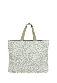 Femme portant un haut blanc et un jean bleu, portant un grand sac cabas gris avec un imprimé léopard vert et des anses vert olive.