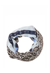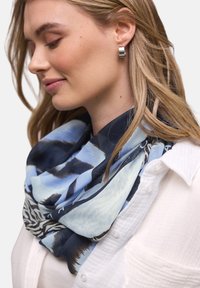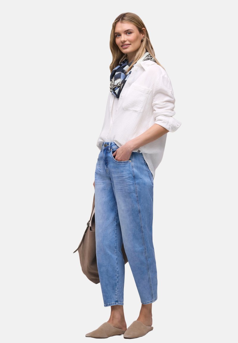 Jeune femme portant une chemise blanche boutonnée, un jean bleu, une écharpe à motifs, des mocassins beige et tenant un sac à main taupe.
