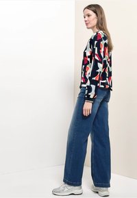 Femme portant un chemisier géométrique multicolore aux manches retroussées, un jean bleu et des baskets blanches, debout devant un mur clair uni.