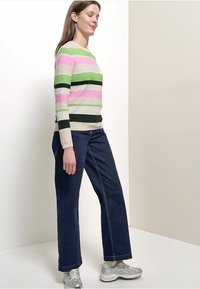 Personne portant un pull rayé rose, vert et beige avec un jean bleu foncé et des baskets blanches, tenant une veste marron dans la main gauche.