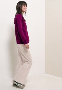 Femme souriante appuyée contre un mur, portant un cardigan violet vif boutonné sur une chemise blanche et un pantalon taille haute beige.
