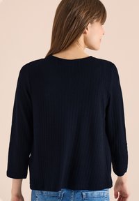 Femme souriante, portant une casquette bleu clair, un haut beige, un cardigan bleu foncé ouvert avec des manches retroussées, et un jean bleu, sur un fond uni.