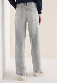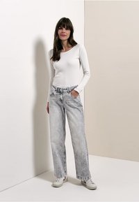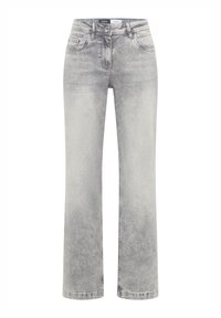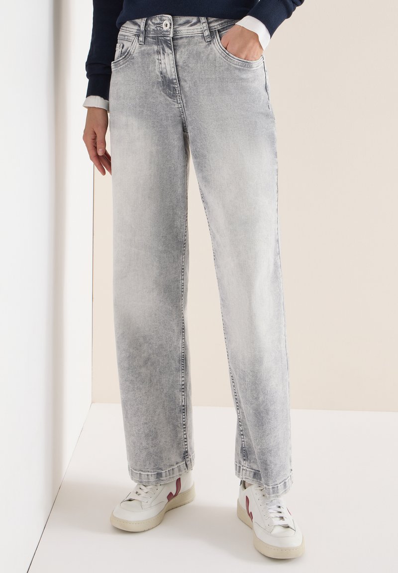 Jean droit gris clair avec un effet délavé, cinq poches, passants pour ceinture, et une fermeture par bouton, porté avec des baskets blanches.