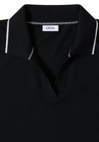 Femme portant un polo noir à manches courtes avec un col blanc bordé, et un pantalon beige, appuyée contre un mur de couleur claire.