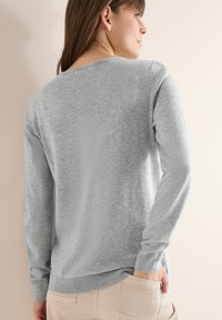 Femme aux cheveux bruns portant un pull léger à col en V manches longues gris clair et un pantalon beige, debout devant un fond beige uni.