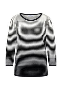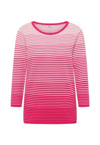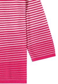 Femme debout, les mains dans les poches, portant un shirt à manches longues rouge et blanc rayé, un jean bleu et un sac à bandoulière marron.