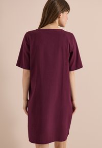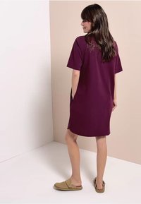 Femme souriante portant une robe violette texturée à manches courtes avec des liens à pompons, portant un grand sac à épaule tissé.