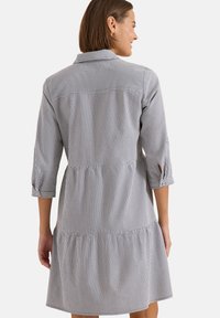 Femme portant une robe à rayures verticales noires et blanches, longueur genou, avec manches 3/4 et col, posant de dos à la caméra.