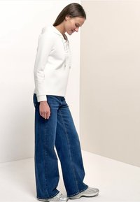 Sweat à capuche blanc avec un col à lacets et des cordons contrastants. Manches longues et coupe décontractée, associé à un jean bleu en denim.