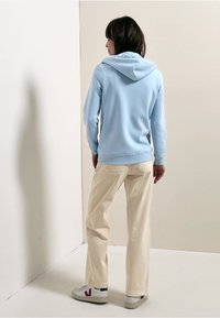 Femme souriante portant un sweat à capuche bleu clair zippé sur un t-shirt blanc, pantalon beige, debout devant un fond uni avec une main dans la poche.