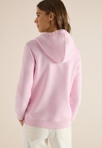 Jeune femme souriante, portant un sweat à capuche zippé rose clair sur un t-shirt blanc et un pantalon crème, debout devant un fond beige.