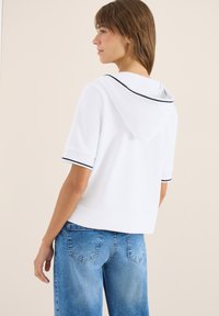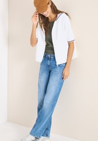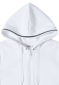 Jeune femme portant une casquette marron, un sweat à capuche blanc à manches courtes avec fermeture éclair, un débardeur côtelé vert et un jean bleu, debout les mains derrière le dos.