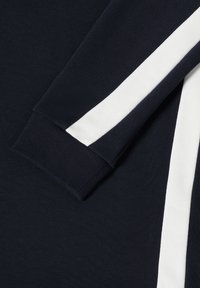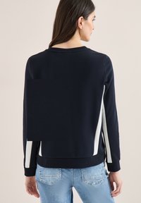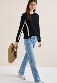 Jeune femme aux cheveux longs bruns portant un haut noir à manches longues avec des rayures blanches sur les côtés et un jean bleu, les mains dans les poches, souriante.