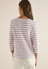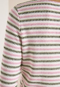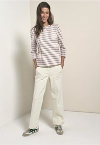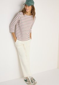 Femme aux longs cheveux bruns portant une casquette verte, un chemisier à manches longues rayé rose et vert, et un pantalon beige clair, les mains dans les poches.