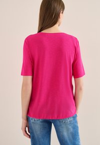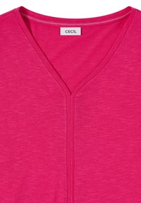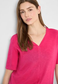 Femme debout contre un mur, vêtue d'un top rose vif à col en V, d'un jean large bleu clair et de baskets argentées, la main dans la poche.