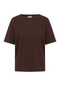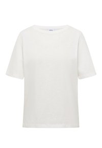 Femme aux cheveux bruns portant un t-shirt blanc uni à manches courtes et un pantalon beige, mains posées dans les poches arrière, tournée de dos.