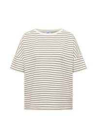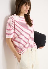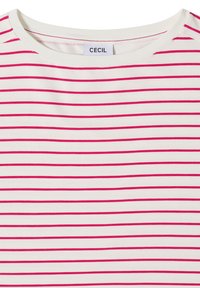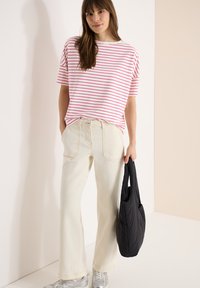 Femme portant une chemise blanche à rayures roses et un pantalon crème, tenant une veste noire pliée sur un fond blanc.