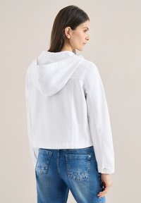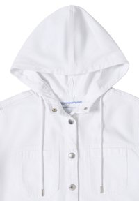 Jeune femme portant une veste blanche boutonnée sur une chemise rayée et un jean bleu, tenant un sac fourre-tout foncé sur son épaule.