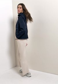 Femme portant une veste à capuche bleu marine sur un pull marron à col en V et un pantalon beige, debout devant un fond clair uni.