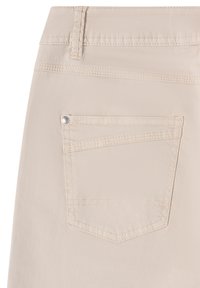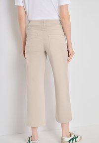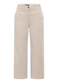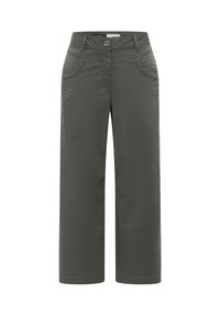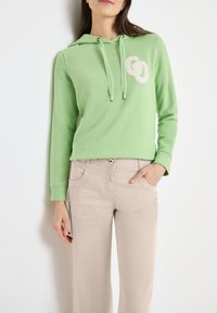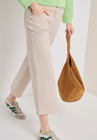 Femme portant un sweat à capuche vert clair et un pantalon large beige, tenant un sac en daim marron dans sa main droite, debout devant un mur blanc.