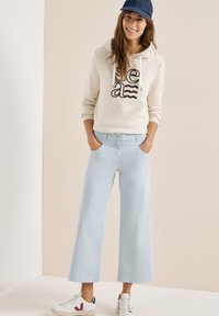 Femme portant un pantalon large bleu clair, un haut à manches longues beige et des baskets blanches avec des accents rouges, debout contre un mur blanc.