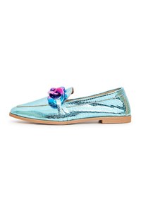 Chaussures plates métalliques turquoise avec une finition texturée. Ornements floraux en bleu et rose sur l'avant. Semelle en caoutchouc.