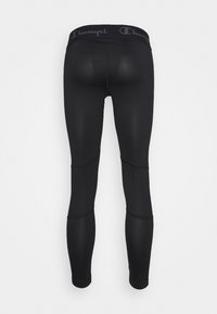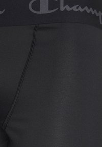 Leggings noirs en tissu extensible, dotés d'une large taille noire avec le logo "Champion" et d'un petit logo blanc sur la cuisse.