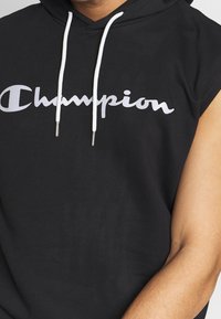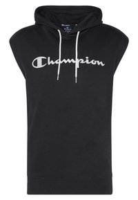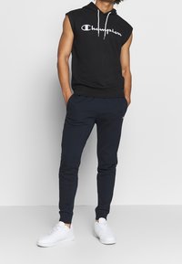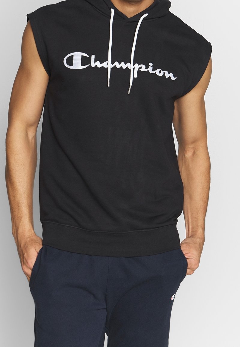 Homme portant un hoodie sans manches noir de Champion avec des cordons blancs et un pantalon bleu marine avec un logo, les mains dans les poches, devant un fond neutre.