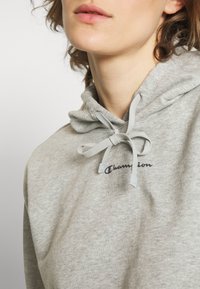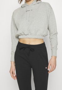 Sweat à capuche gris court avec cordon de serrage et ourlet élastique, associé à un pantalon de survêtement noir avec taille à cordon et logo sur la cuisse.