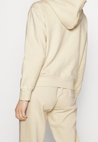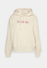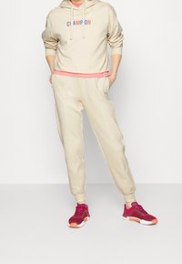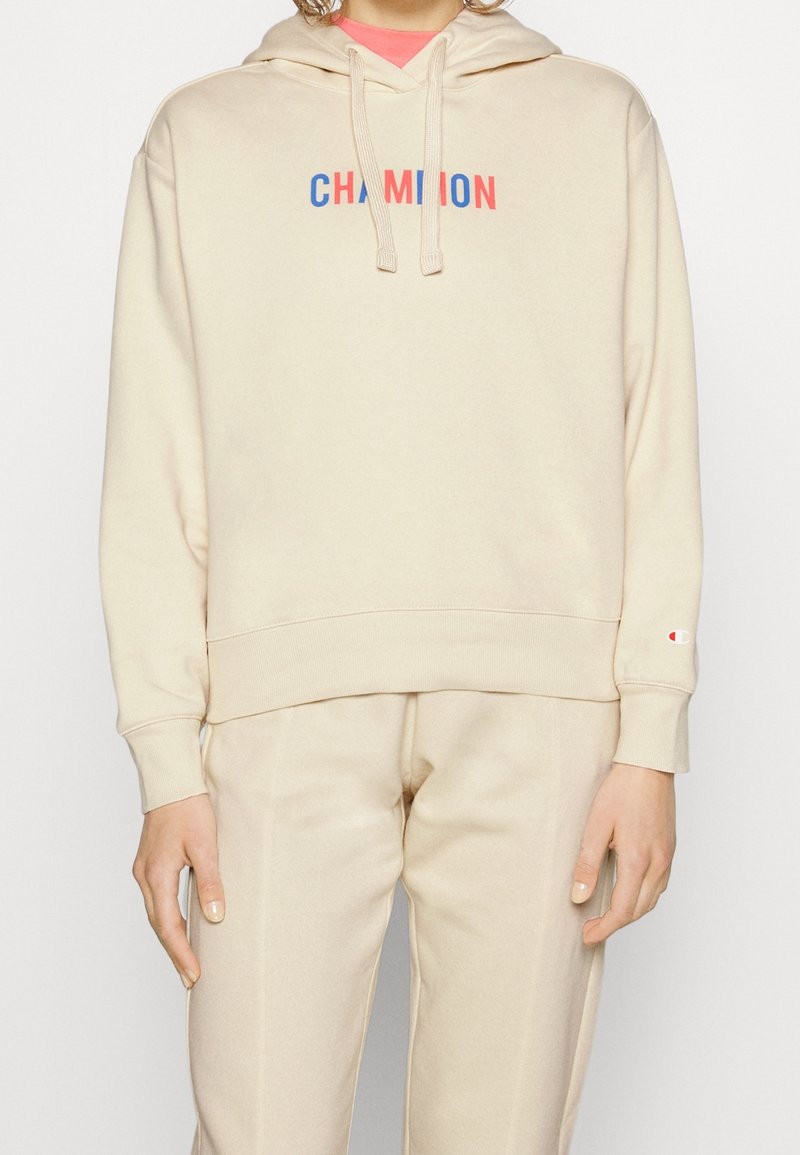 Personne portant un sweat à capuche beige et un pantalon assorti, avec l'inscription "CHAMPION" en lettres rouges et bleues sur le devant.