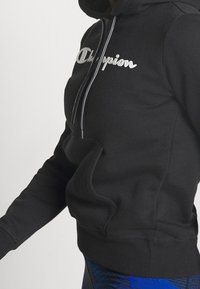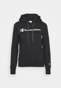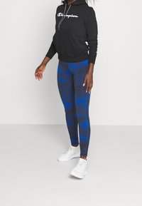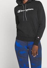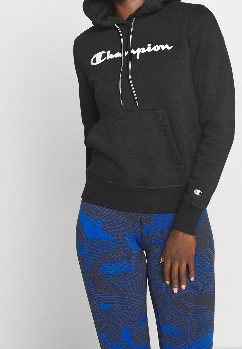 Haut à capuche en coton noir avec le logo blanc "Champion", doté d'une poche avant et d'un cordon de serrage, associé à des leggings bleus à motifs.