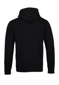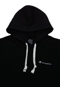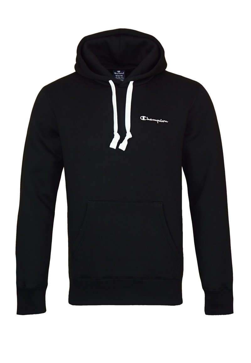 Sweat à capuche noir Champion avec cordons blancs, poche kangourou à l'avant, et petit logo brodé sur la poitrine gauche.