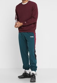 Homme portant un sweat-shirt teal avec des logos blancs sur la poitrine et les manches, associé à un pantalon de jogging gris clair avec un patch noir.