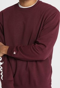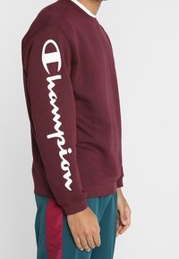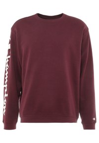 Sweatshirt bordeaux à col rond, accents blancs, et grand logo "Champion" en cursive sur la manche. Tissu en coton avec une coupe décontractée.