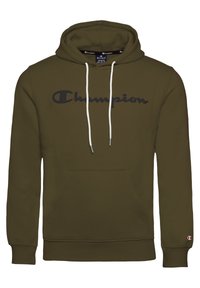 Sweat à capuche Champion vert olive avec logo noir sur la poitrine, cordons blancs, poche avant et petit logo sur le poignet gauche.