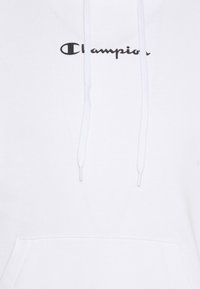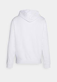 Sweatshirt à capuche blanche avec poche kangourou, poignets côtelés et logo signature sur la poitrine. Présente des détails en bande sur les manches.