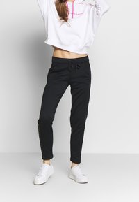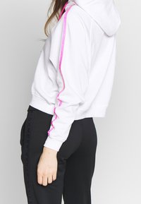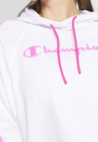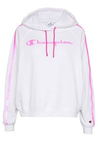 Sweat à capuche blanc avec logo "Champion" rose et accents assortis, doté d'une capuche à cordon de serrage et de poignets côtelés. Porté avec un pantalon noir.